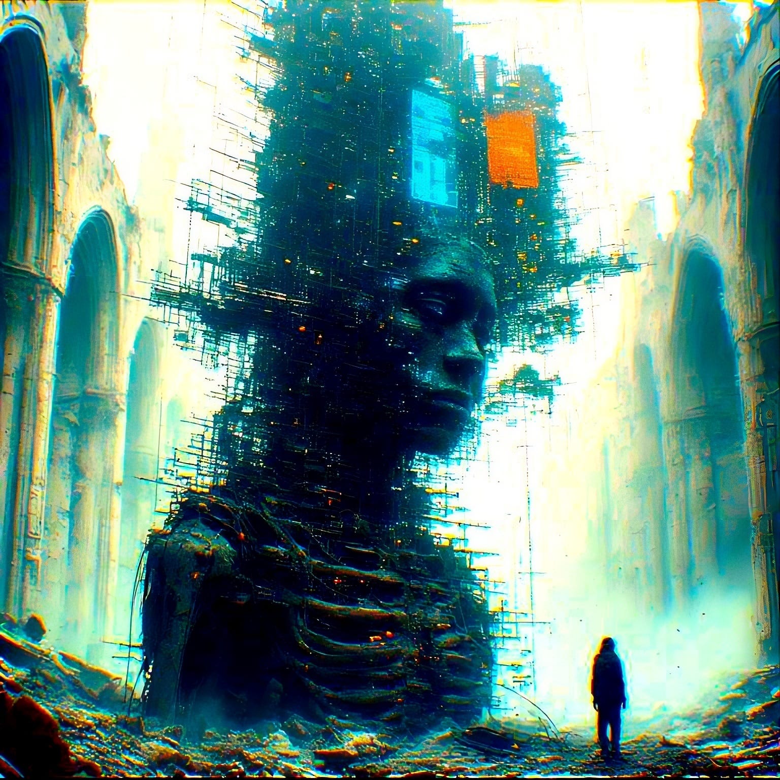 Texture: Airless and vast at the same time. The sensation of standing inside a server cathedral buried beneath ruins.