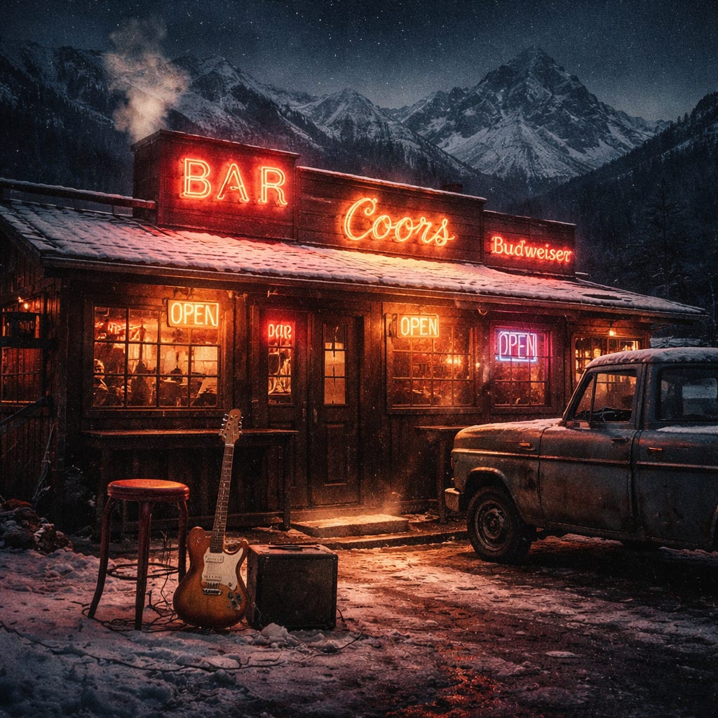 “Create a dirty garage-Americana rock song with strong influences from drunken heartland rock and desert psychedelia. Sound like a bar band playing in a mountain town after midnight: loose drums, jangly overdriven guitars, melodic post-punk bass, occasional harmonica and detuned piano. Vocals raw and imperfect, emotionally charged. Tempo ranges 80–130 BPM. Atmosphere cinematic, nostalgic, reckless, and mythic, like watching the American dream unravel across highways and mountain towns under neon bar lights and powered by God-knows-what.”