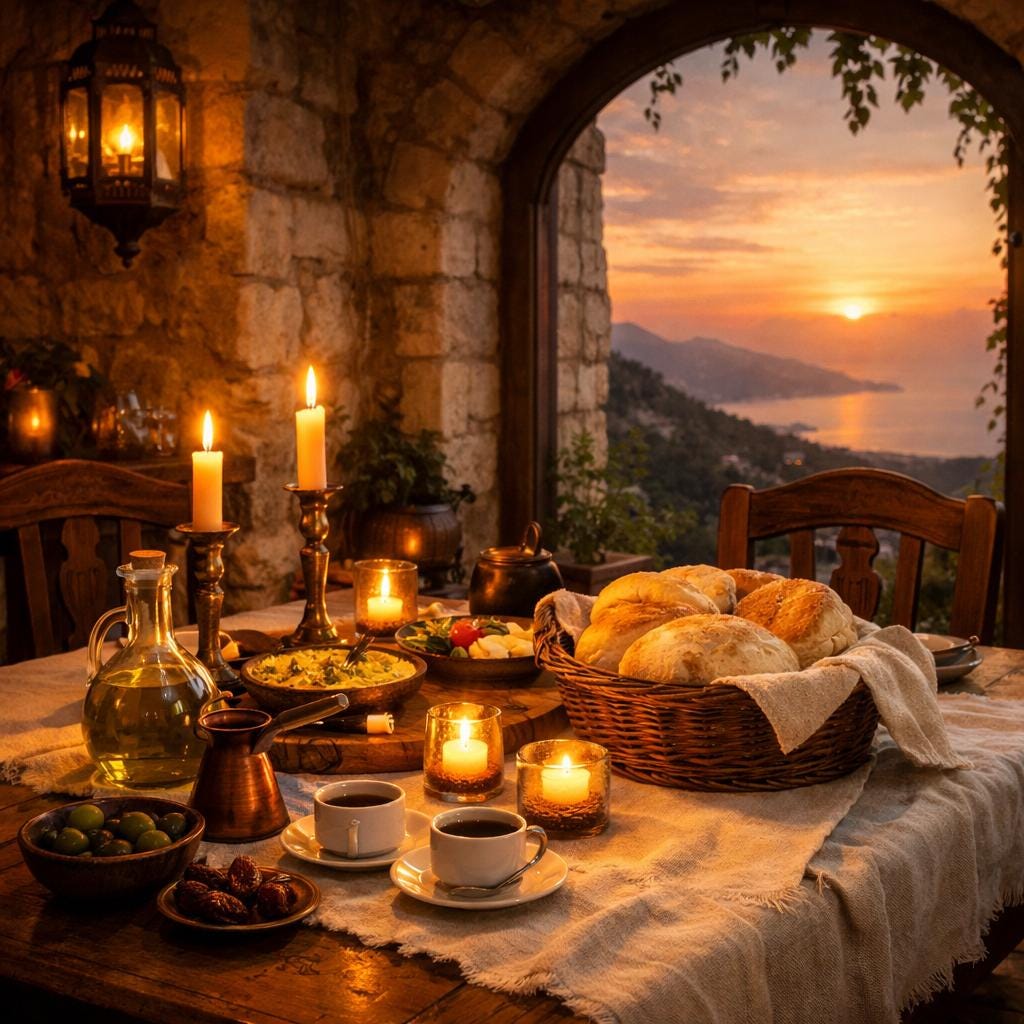 [Soft fingerpicked oud, the sound of a ceramic bowl on a stone table, a distant ney]