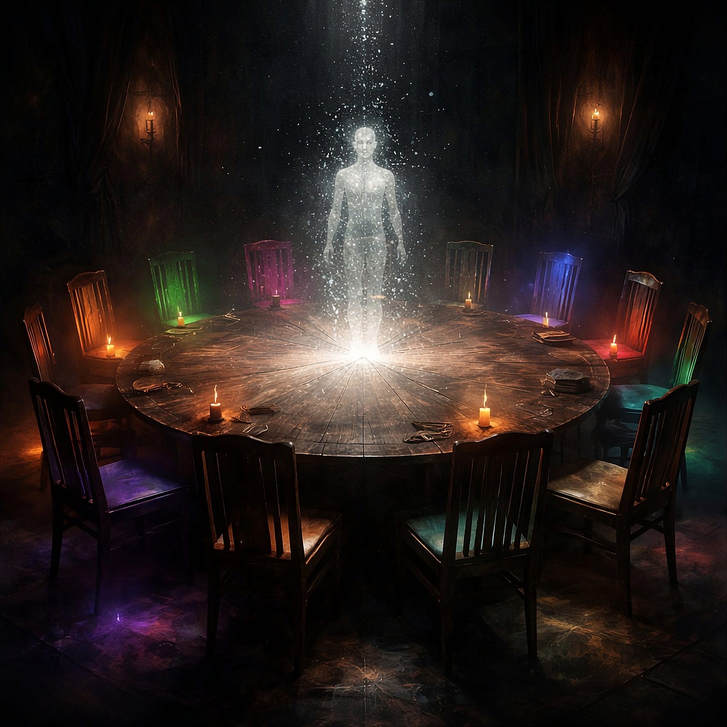 A table, round and deliberate. Twelve chairs placed with impossible symmetry.